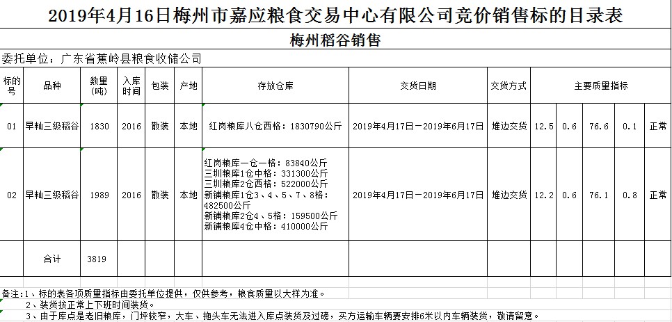 交易時間和地點:2019年4月16日(星期二)上午10時。廣東省梅州市彬芳大道南161號梅州市糧食交易中心3樓。