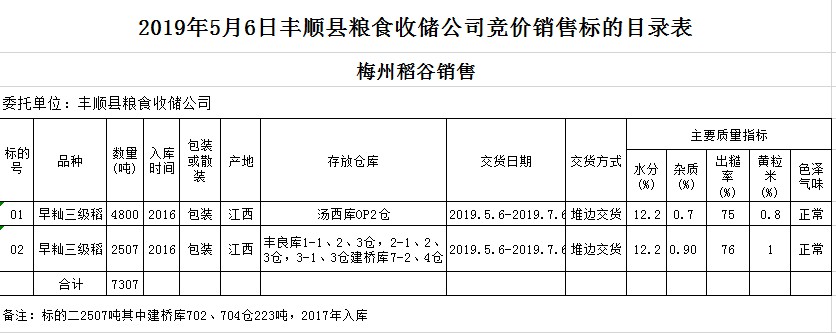 受客戶委托,梅州市嘉應(yīng)糧食交易中心有限公司定于2019年5月6日(星期一)舉辦糧食競價交易會,豐順縣糧食收儲公司擬銷售2016年早秈稻7084噸2017年早秈稻223噸。