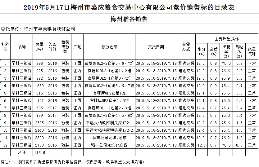 受客戶委托,梅州市嘉應(yīng)糧食交易中心有限公司定于2019年5月17日(星期五)舉辦糧食競價交易會,梅州市嘉泰糧食收儲公司擬銷售2016年、2017年早秈稻17646噸。