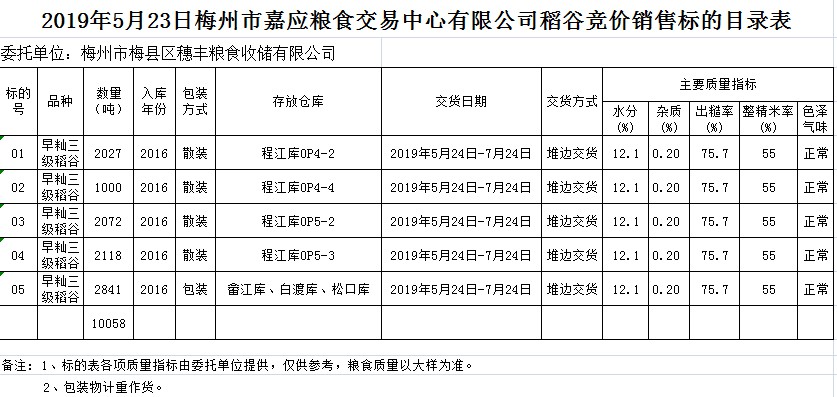 受客戶委托,梅州市嘉應(yīng)糧食交易中心有限公司定于2019年5月23日(星期四)舉辦糧食競價(jià)交易會,梅州市梅縣區(qū)穗豐糧食收儲有限公司擬銷售2016年早秈稻10058噸。