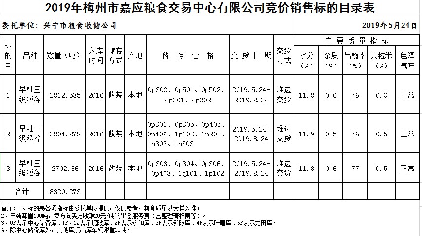 受客戶委托,梅州市嘉應糧食交易中心有限公司定于2019年5月24日(星期五)舉辦糧食競價交易會,興寧市糧食收儲公司擬銷售2016年早秈稻8320.273噸。