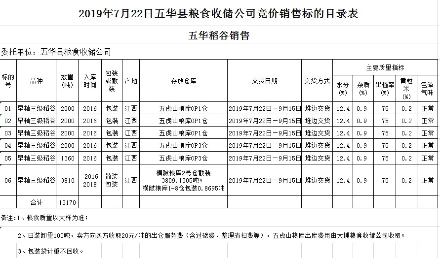 受客戶委托,梅州市嘉應(yīng)糧食交易中心有限公司定于2019年7月22日(星期一)舉辦糧食競價交易會,廣東省五華縣糧食收儲公司擬銷售2016年早秈稻13169.1305噸,2018年早秈稻0.8695噸。