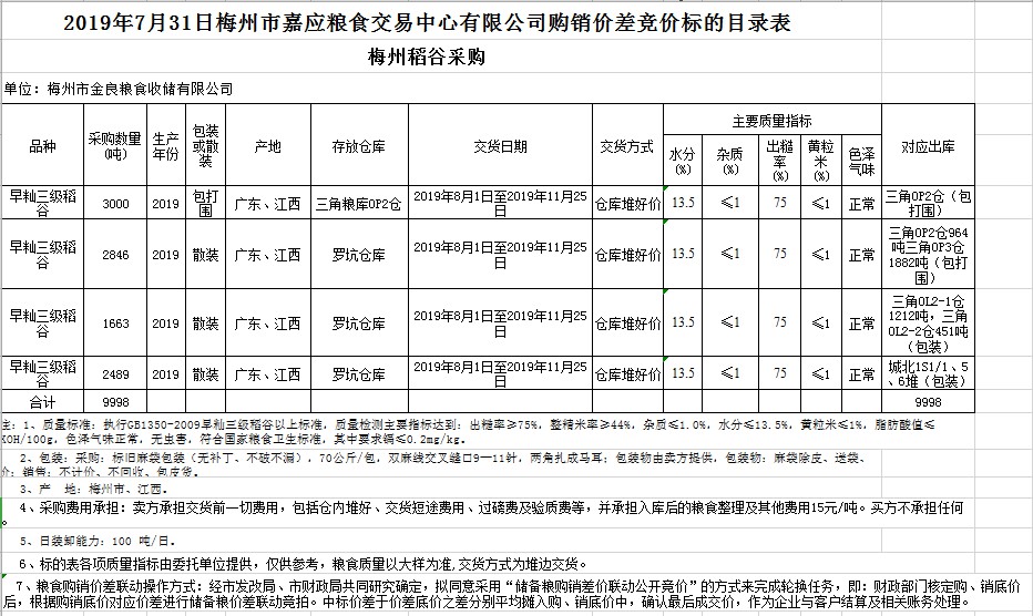 交易時(shí)間和地點(diǎn):20197月31日(星期三)上午10時(shí)。廣東省梅州市彬芳大道南161號梅州市糧食交易中心3樓。