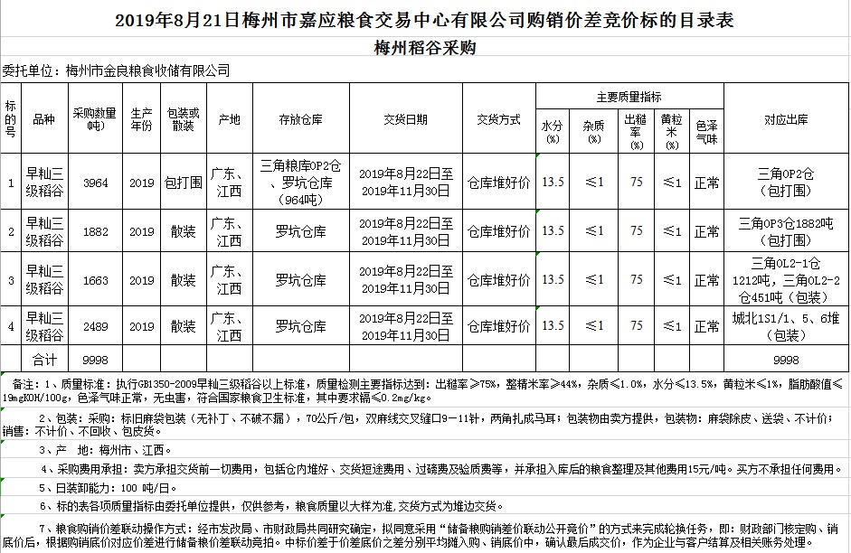受客戶委托,梅州市嘉應(yīng)糧食交易中心有限公司定于2019年8月21日(星期三)舉辦稻谷購(gòu)銷價(jià)差聯(lián)動(dòng)標(biāo)的交易會(huì),梅州市金良糧食收儲(chǔ)有限公司擬銷售和采購(gòu)早秈稻9998噸。