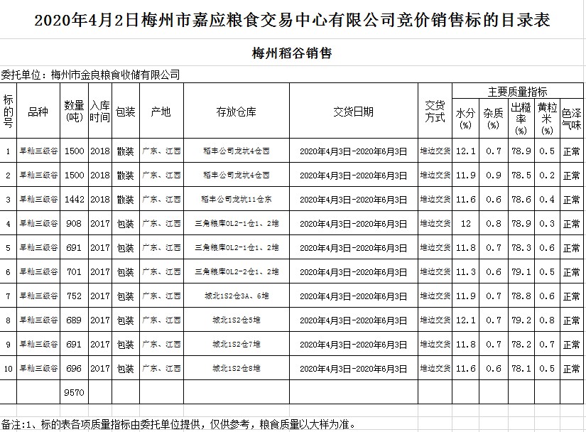 受客戶(hù)委托,梅州市嘉應(yīng)糧食交易中心有限公司定于2020年4月2日(星期四)舉辦糧食競(jìng)價(jià)交易會(huì),梅州市金良糧食收儲(chǔ)有限公司擬銷(xiāo)售2017年、2018年早秈稻9570噸。