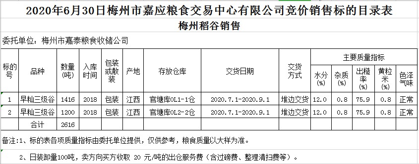 受客戶委托,梅州市嘉應(yīng)糧食交易中心有限公司定于2020年6月30日(星期二)舉辦糧食競價交易會,梅州市嘉泰糧食收儲公司擬銷售2018年早秈稻2616噸。
