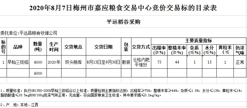 交易時間和地點(diǎn):20208月7日(星期五)上午10。廣東省梅州市彬芳大道南161號梅州市糧食交易中心3樓。