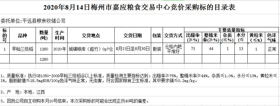 受客戶(hù)委托,梅州市嘉應(yīng)糧食交易中心有限公司定于2020年8月14日(星期五)舉辦糧食競(jìng)價(jià)交易會(huì),平遠(yuǎn)縣糧食收儲(chǔ)公司擬采購(gòu)2020年早秈稻1260噸。