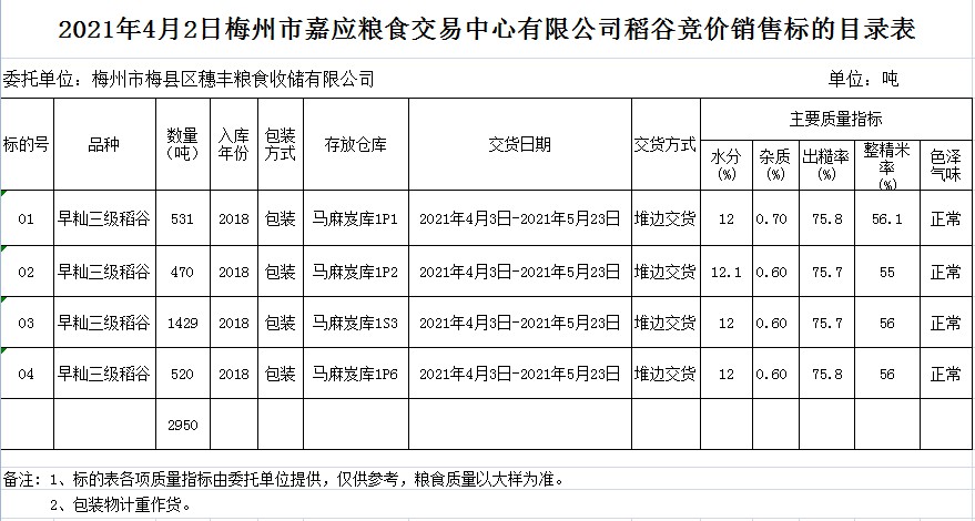 受客戶委托,梅州市嘉應(yīng)糧食交易中心有限公司定于2021年4月2日(星期五)舉辦糧食競價交易會。梅州市梅縣區(qū)穗豐糧食收儲有限公司擬銷售2018年早秈稻2950噸。