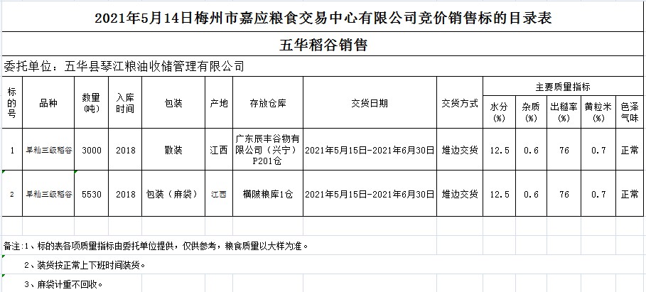 2021年5月14日五華縣琴江糧油收儲管理有限公司稻谷銷售