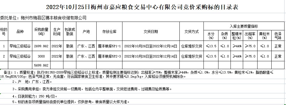 受客戶委托,梅州市嘉應(yīng)糧食交易中心有限公司定于2022年10月25日(星期二)舉辦糧食競價交易會。梅州市梅縣區(qū)穗豐糧食收儲有限公司擬采購2022年早秈稻5699.862噸。