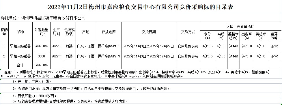 受客戶委托,梅州市嘉應(yīng)糧食交易中心有限公司定于2022年11月2日(星期三)舉辦糧食競價交易會。梅州市梅縣區(qū)穗豐糧食收儲有限公司擬采購2022年早秈稻5699.862噸。