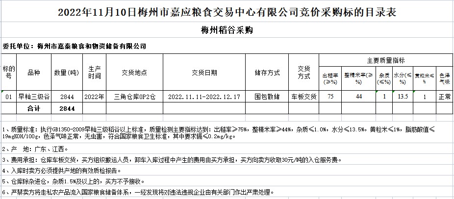 2022年11月10日梅州市嘉泰糧食和物資儲備有限公司稻谷采購