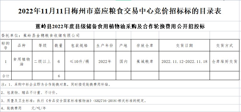 蕉嶺縣2022年度縣級儲備食用植物油采購及合作輪換費用公開招投標(biāo)公告
