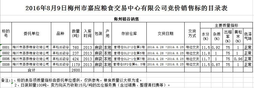 受客戶委托,梅州市嘉應糧食交易中心有限公司定于2016年8月9日舉辦糧食競價交易會,梅州市嘉泰糧食收儲公司擬銷售2013年產早秈三級稻谷2600噸。