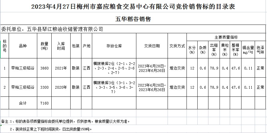 2023年4月27日五華縣琴江糧油收儲(chǔ)管理有限公司稻谷銷售