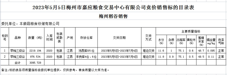 受客戶委托,梅州市嘉應(yīng)糧食交易中心有限公司定于2023年5月5日(星期五)舉辦糧食競價交易會。豐順縣糧食收儲有限公司擬銷售2020年早秈稻3095.728噸。