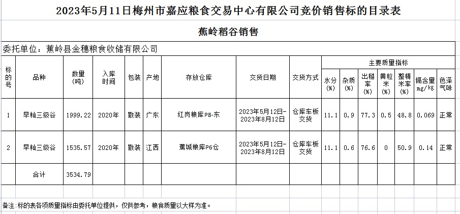 受客戶委托,梅州市嘉應(yīng)糧食交易中心有限公司定于2023年5月11日(星期四)舉辦糧食競(jìng)價(jià)交易會(huì)。蕉嶺縣金穗糧食收儲(chǔ)有限公司擬銷(xiāo)售2020年早秈稻3534.79噸。