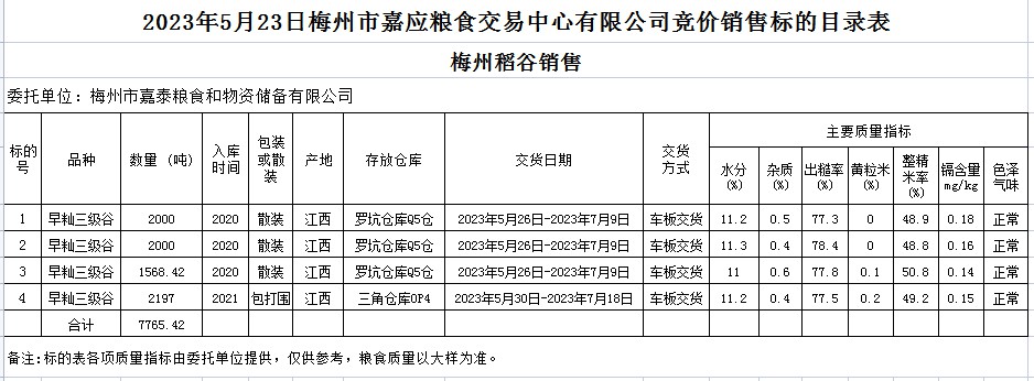 受客戶委托,梅州市嘉應(yīng)糧食交易中心有限公司定于2023年5月23日(星期二)舉辦糧食競(jìng)價(jià)交易會(huì)。梅州市嘉泰糧食和物資儲(chǔ)備有限公司擬銷售2020年、2021年早秈稻7765.42噸。