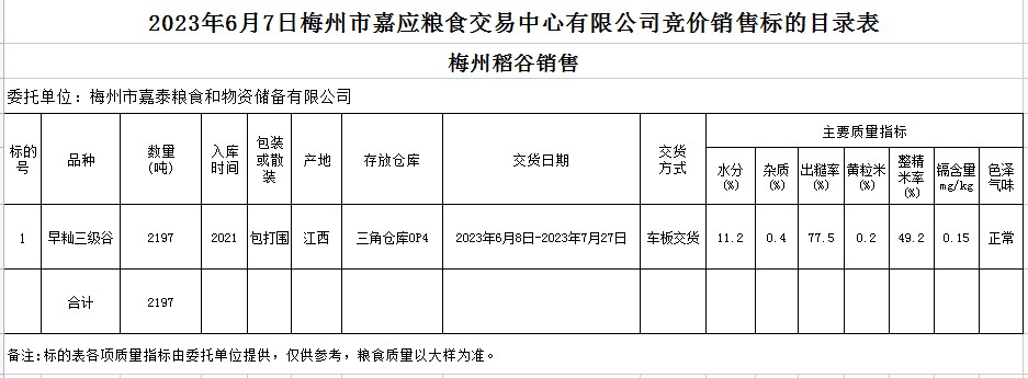 受客戶委托,梅州市嘉應(yīng)糧食交易中心有限公司定于2023年6月7日(星期三)舉辦糧食競價交易會。梅州市嘉泰糧食和物資儲備有限公司擬銷售2021年早秈稻2197噸。