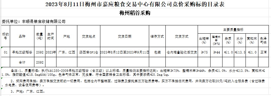 受客戶委托,梅州市嘉應(yīng)糧食交易中心有限公司定于2023年8月11日(星期五)舉辦糧食競(jìng)價(jià)交易會(huì)。豐順縣糧食收儲(chǔ)有限公司擬采購(gòu)2023年早秈稻2592噸。