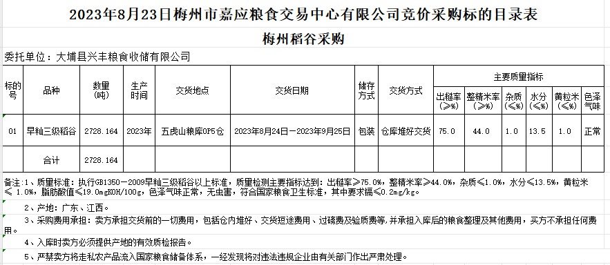 受客戶委托,梅州市嘉應糧食交易中心有限公司定于2023年8月23日(星期三)舉辦糧食競價交易會。大埔縣興豐糧食收儲有限公司擬采購2023年早秈稻2728.164噸。