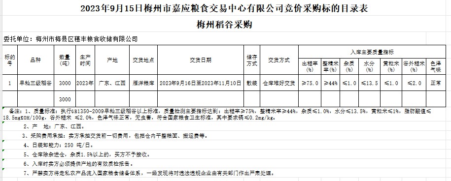 受客戶委托,梅州市嘉應(yīng)糧食交易中心有限公司定于2023年9月15日(星期五)舉辦糧食競價交易會。梅州市梅縣區(qū)穗豐糧食收儲有限公司擬采購2023年產(chǎn)早秈稻3000噸。