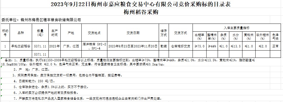 受客戶(hù)委托,梅州市嘉應(yīng)糧食交易中心有限公司定于2023年9月22日(星期五)舉辦糧食競(jìng)價(jià)交易會(huì)。梅州市梅縣區(qū)穗豐糧食收儲(chǔ)有限公司擬采購(gòu)2023年產(chǎn)早秈稻5371.11噸。