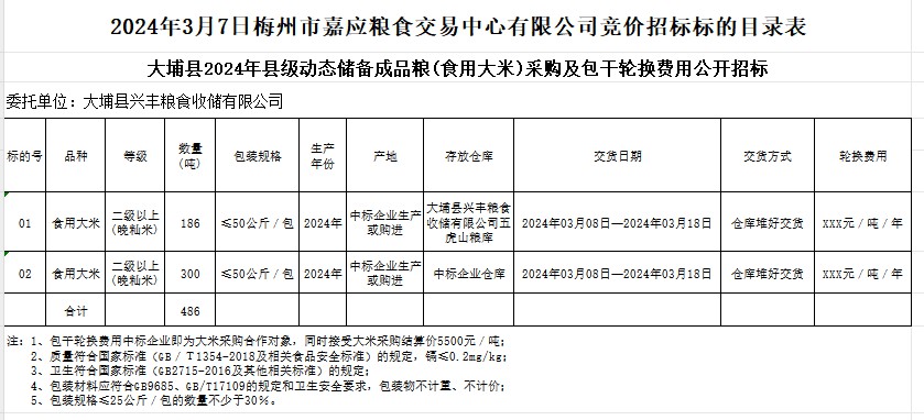 大埔縣2024年縣級(jí)動(dòng)態(tài)儲(chǔ)備成品糧(食用大米)采購(gòu)及包干輪換費(fèi)用公開(kāi)招標(biāo)公告