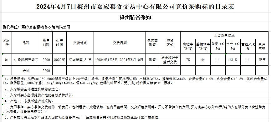 受客戶委托,梅州市嘉應(yīng)糧食交易中心有限公司定于2024年4月7日(星期天)舉辦糧食競(jìng)價(jià)交易會(huì)。蕉嶺縣金穗糧食收儲(chǔ)有限公司擬采購2023年產(chǎn)中晚秈稻2200噸。