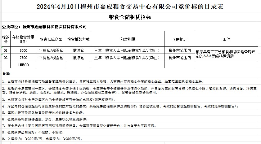 2024年4月10日梅州市嘉泰糧食和物資儲備有限公司糧食倉儲租賃招標(biāo)公告