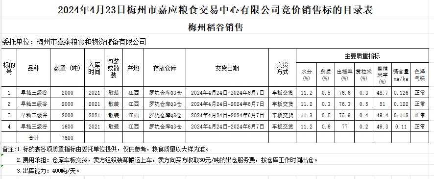 2024年4月23日梅州市嘉泰糧食和物資儲備有限公司稻谷銷售