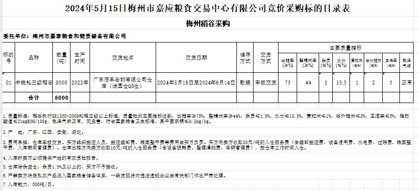 2024年5月15日梅州市嘉泰糧食和物資儲備有限公司稻谷采購