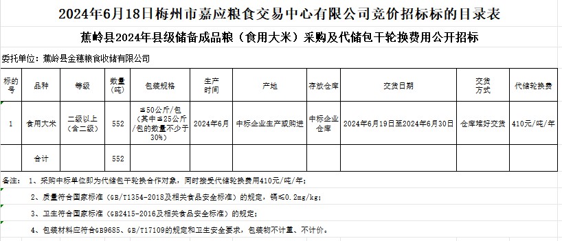 文件下載:2024年6月18日蕉嶺縣2024年縣級儲備成品糧(食用大米)采購及代儲包干輪換費用公開招標公告