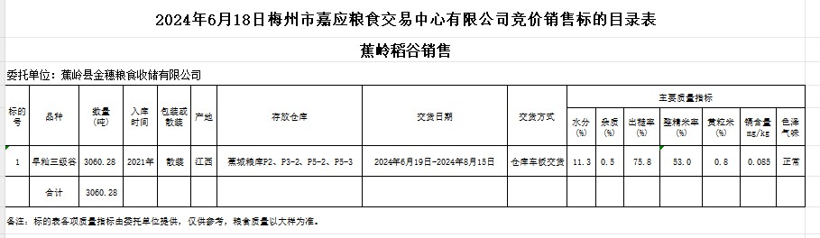 受客戶委托,梅州市嘉應(yīng)糧食交易中心有限公司定于2024年6月18日(星期二)舉辦糧食競(jìng)價(jià)交易會(huì)。蕉嶺縣金穗糧食收儲(chǔ)有限公司擬銷(xiāo)售2021年產(chǎn)早秈稻3060.28噸。