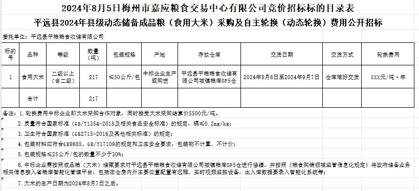 受客戶委托,梅州市嘉應(yīng)糧食交易中心有限公司定于2024年8月5日(星期一)上午10時在廣東省梅州市彬芳大道南161號梅州市糧食交易中心3樓,舉辦平遠縣2024年縣級動態(tài)儲備成品糧(食用大米)采購及自主輪換(動態(tài)輪換)費用公開招標(biāo)。