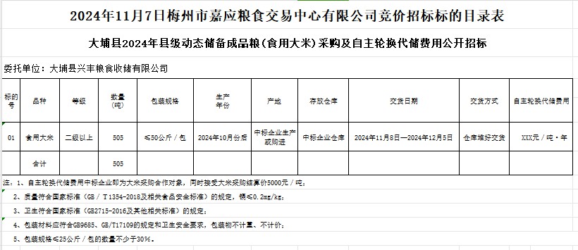 受客戶委托,梅州市嘉應糧食交易中心有限公司定于2024年11月7日(星期四)上午10時在廣東省梅州市彬芳大道南161號梅州市糧食交易中心3樓,舉辦大埔縣2024年縣級動態(tài)儲備成品糧(食用大米)采購及自主輪換代儲費用公開招標。