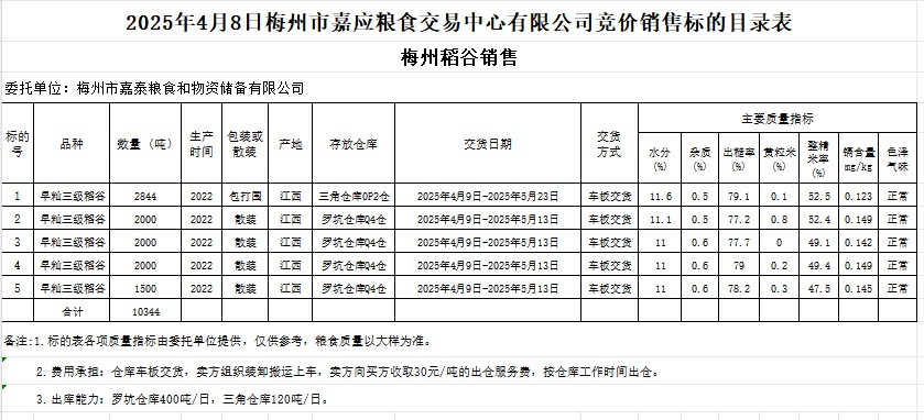 2025年4月8日梅州市嘉泰糧食和物資儲備有限公司稻谷銷售