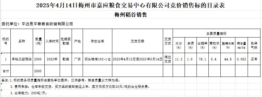 受客戶委托,梅州市嘉應(yīng)糧食交易中心有限公司定于2025年4月14日(星期一)舉辦糧食競(jìng)價(jià)交易會(huì)。平遠(yuǎn)縣平糧糧食收儲(chǔ)有限公司擬銷(xiāo)售2022年產(chǎn)早秈稻谷2000噸。