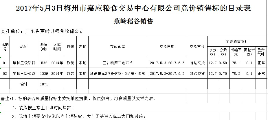 受客戶委托,梅州市嘉應(yīng)糧食交易中心有限公司定于2017年5月3日舉辦糧食競(jìng)價(jià)交易會(huì),廣東省蕉嶺縣糧食收儲(chǔ)公司擬銷(xiāo)售2014年早秈三級(jí)稻谷1871噸。