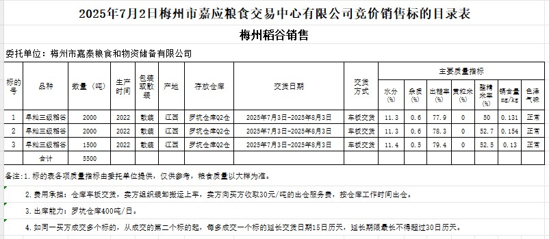 受客戶委托,梅州市嘉應(yīng)糧食交易中心有限公司定于2025年7月2日(星期三)舉辦糧食競價交易會。梅州市嘉泰糧食和物資儲備有限公司擬銷售2022年產(chǎn)早秈稻谷5500噸。