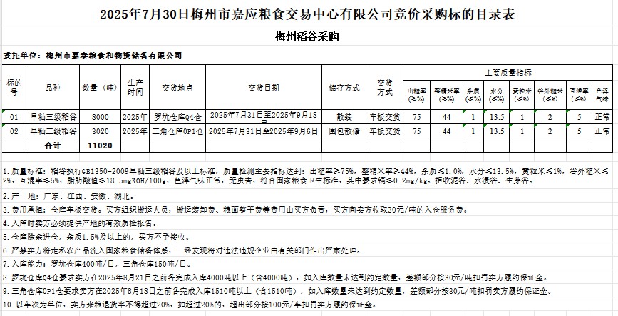 受客戶委托,梅州市嘉應(yīng)糧食交易中心有限公司定于2025年7月30日(星期三)舉辦糧食競價交易會。梅州市嘉泰糧食和物資儲備有限公司擬采購2025年產(chǎn)早秈稻谷11020噸。