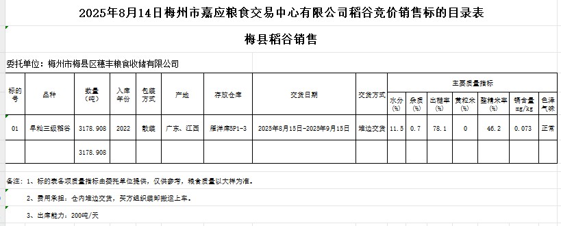 2025年8月14日梅州市梅縣區(qū)穗豐糧食收儲(chǔ)有限公司稻谷銷售