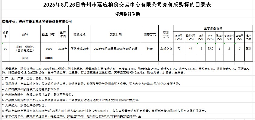 2025年8月26日梅州市嘉泰糧食和物資儲(chǔ)備有限公司稻谷采購(gòu)
