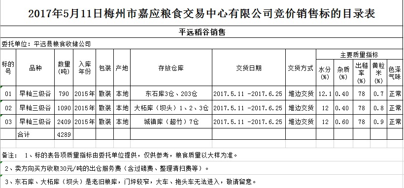 受客戶委托,梅州市嘉應(yīng)糧食交易中心有限公司定于2017年5月11日舉辦糧食競價(jià)交易會(huì),平遠(yuǎn)縣糧食收儲(chǔ)公司擬銷售2015年早秈三級(jí)稻谷4289噸。