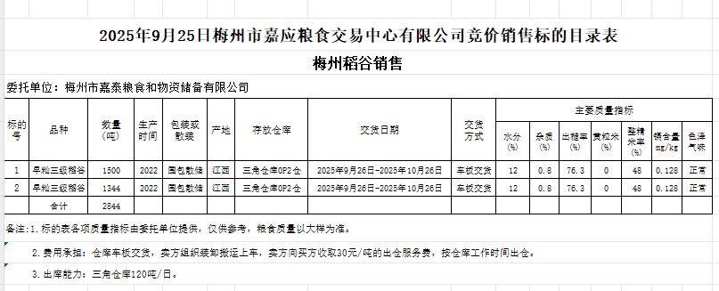 2025年9月25日梅州市嘉泰糧食和物資儲備有限公司稻谷銷售