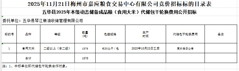 五華縣2025年本級動態(tài)儲備成品糧(食用大米)采購及代儲包干輪換費(fèi)用公開招標(biāo)公告