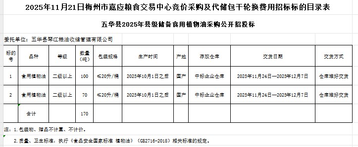 五華縣2025年縣級(jí)儲(chǔ)備食用植物油采購(gòu)及代儲(chǔ)包干輪換費(fèi)用公開招標(biāo)公告