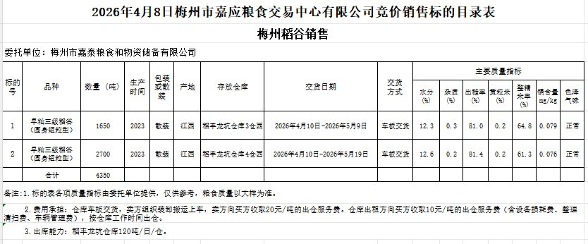 受客戶委托,梅州市嘉應(yīng)糧食交易中心有限公司定于2026年4月8日(星期三)舉辦糧食競價交易會。梅州市嘉泰糧食和物資儲備有限公司擬銷售2023年產(chǎn)早秈稻谷(圓身短粒型)4350噸。