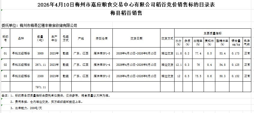 受客戶委托,梅州市嘉應(yīng)糧食交易中心有限公司定于2026年4月10日(星期五)舉辦糧食競價交易會。梅州市梅縣區(qū)穗豐糧食收儲有限公司擬銷售2023年產(chǎn)早秈稻谷7971.11噸。